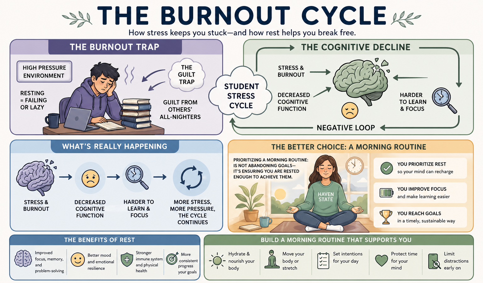 In the high pressure environment of our life it forces us to think that resting means we are failing or being lazy. We see students pulling all-night study sessions that lead other students to feel guilty if they aren't doing the same. However, stress leads to a decrease in your cognitive function, which makes it harder to learn what you are hoping to learn. By prioritizing a morning routine for mental health, you are not abandoning your goals, you are ensuring that you are rested enough to actually reach them in a timely manner. At Haven State, we believe that your best self starts with a well-rested mind.